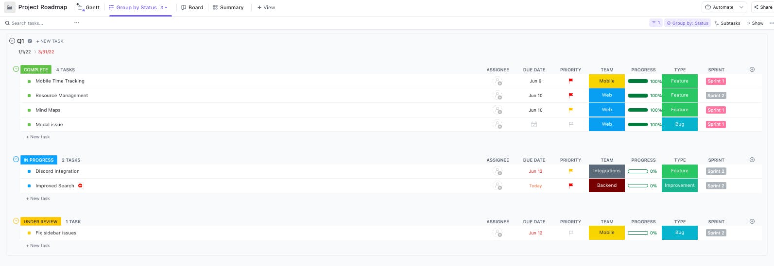 ClickUp’s Project Roadmap template includes:
